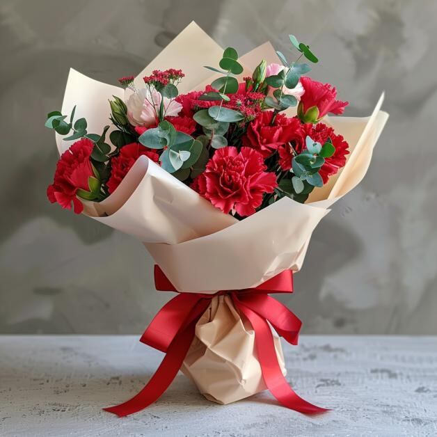鮮やかな赤いカーネーションで彩られた贅沢なブーケ