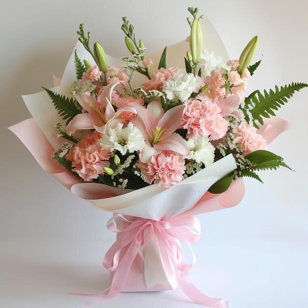 花束の中には、母の愛情を表現するカーネーション、感謝の気持ちを込めたバラ、そして幸せを象徴するユリが含まれています。特別な日に贈る花束に相応しい品質をお届けします。